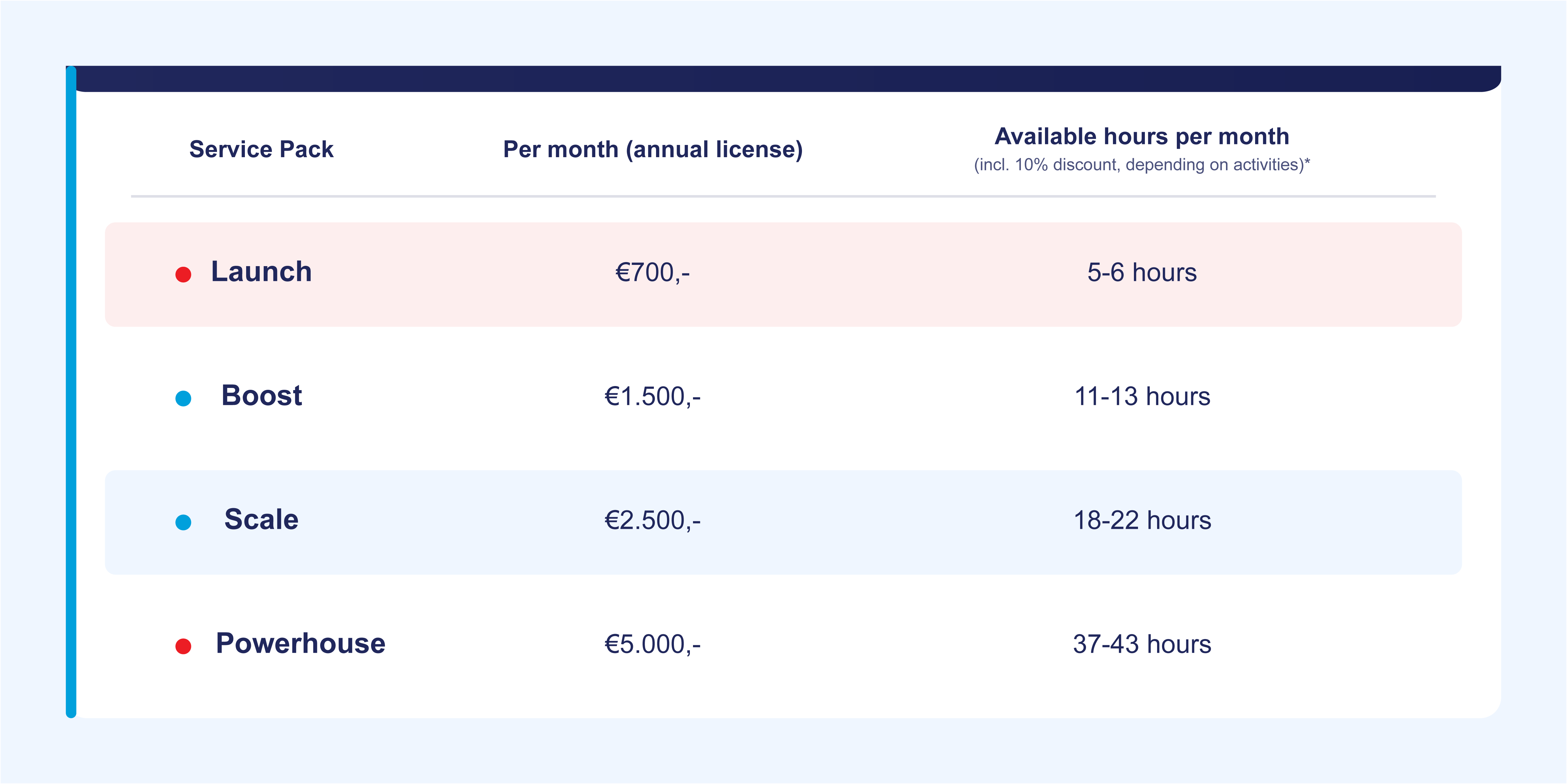 Monthly hours in excess of the Service Pack are billed at regular rates in arrears. It is possible to structurally scale up the Service Pack in the interim.